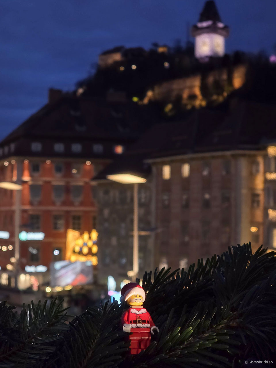 Am Schlossbergplatz angekommen, steht Santa im perfekten Postkartenmotiv: Der Uhrturm leuchtet im Hintergrund, der Weihnachtszauber liegt in der Luft, und Santa fühlt sich sichtlich wohl. Ein kurzer Moment, der die Stimmung des Grazer Advents wunderbar einfängt.
